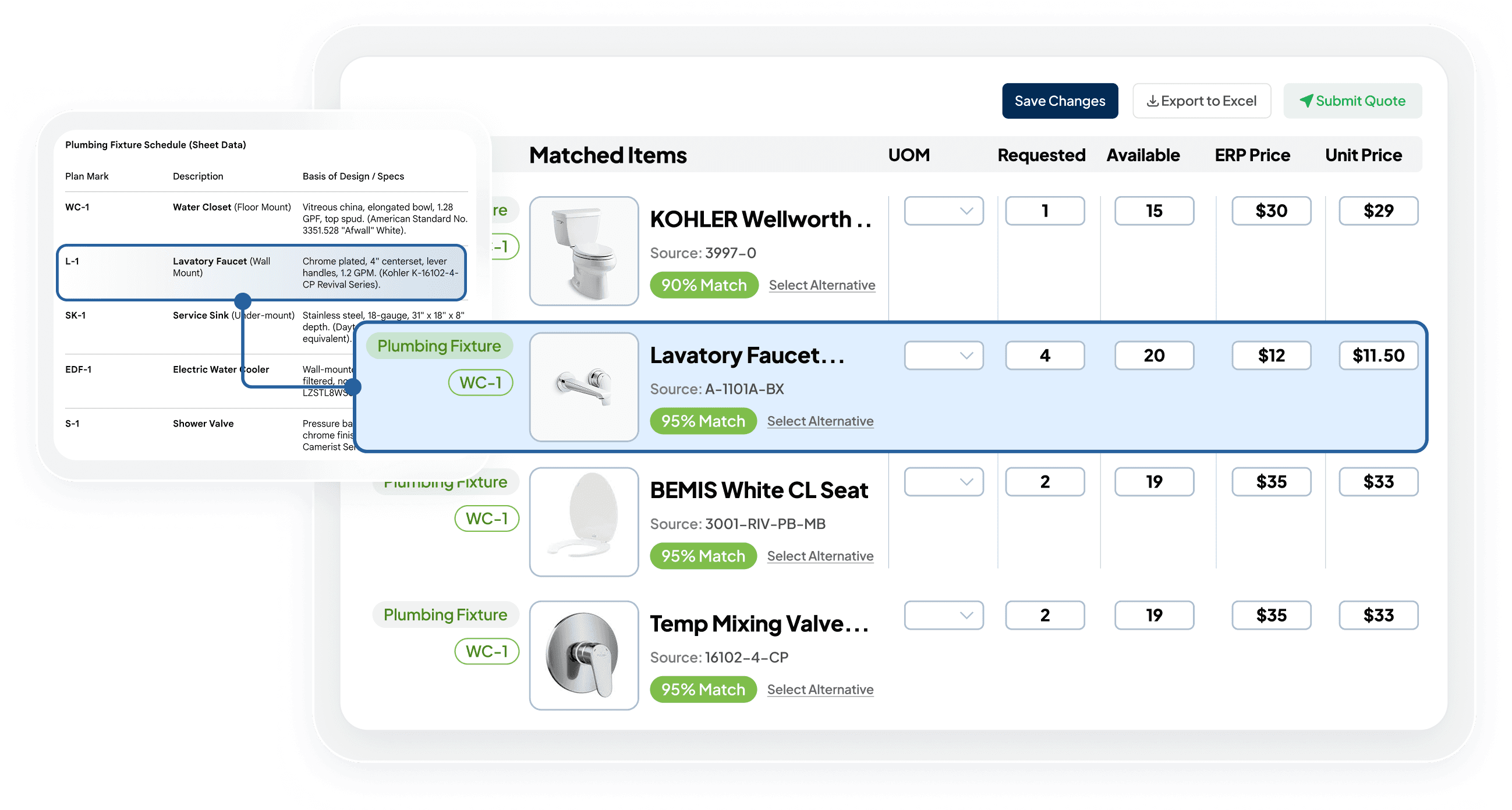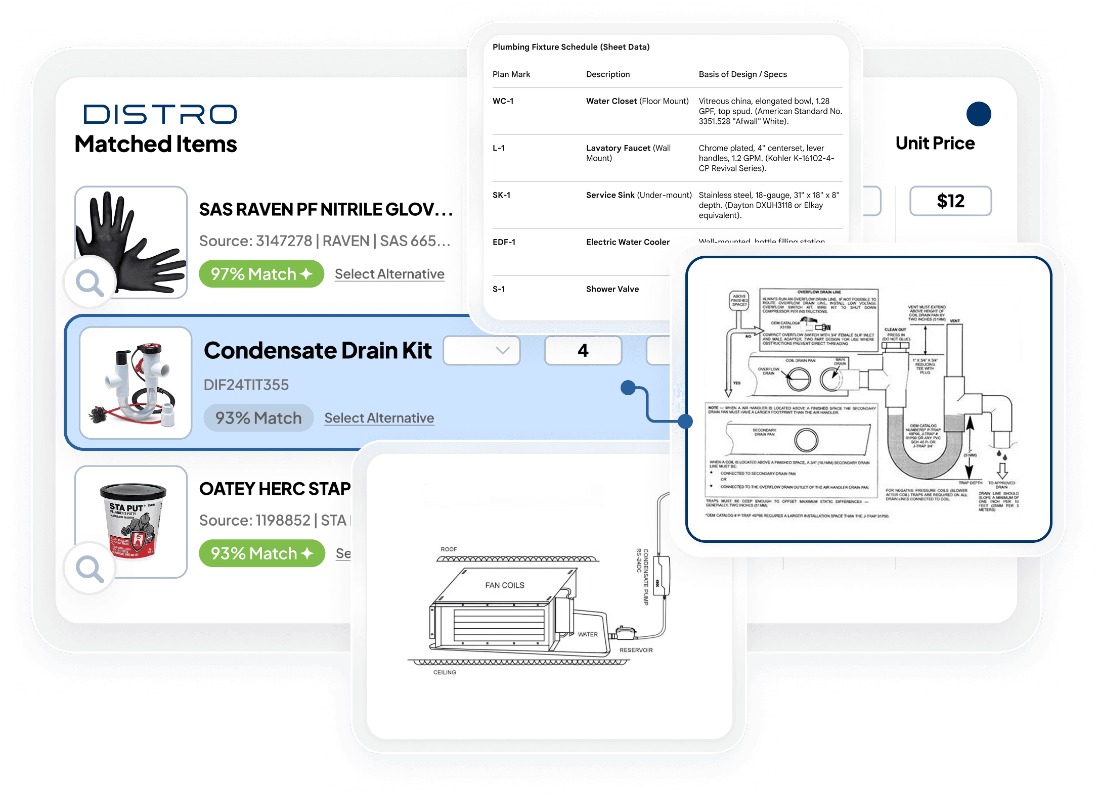 The AI identifies equipment callouts, material specifications, quantities, and sizing requirements across your document set. It understands the relationship between a spec sheet reference and the corresponding detail on page 37 of the drawings.