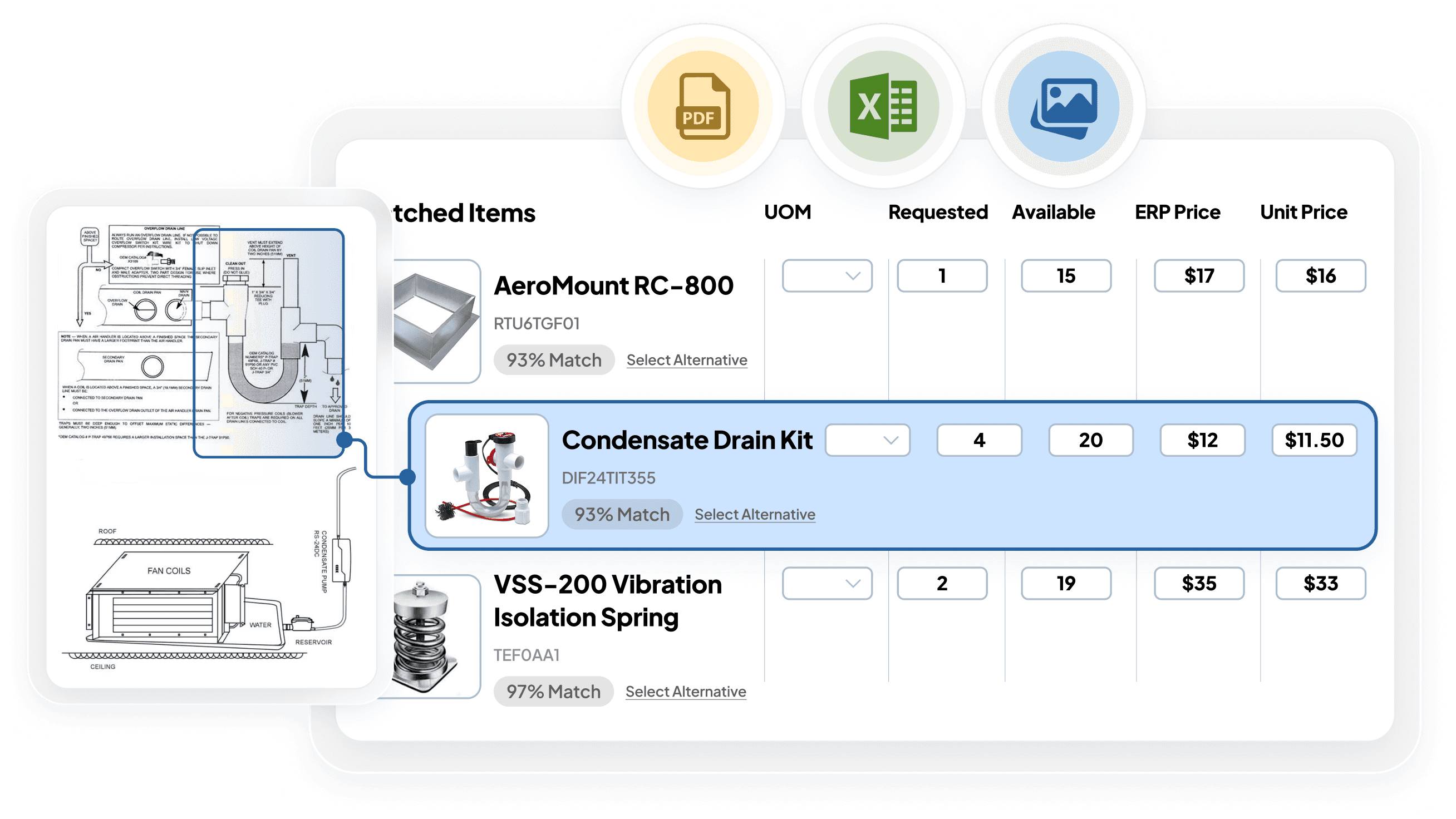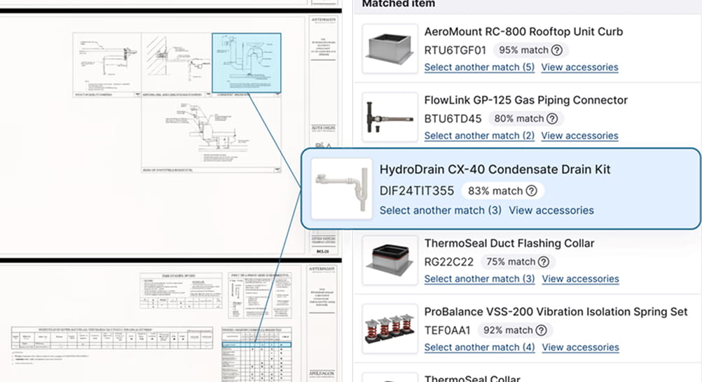 The AI identifies equipment callouts, material specifications, quantities, and sizing requirements across your document set. It understands the relationship between a spec sheet reference and the corresponding detail on page 37 of the drawings.