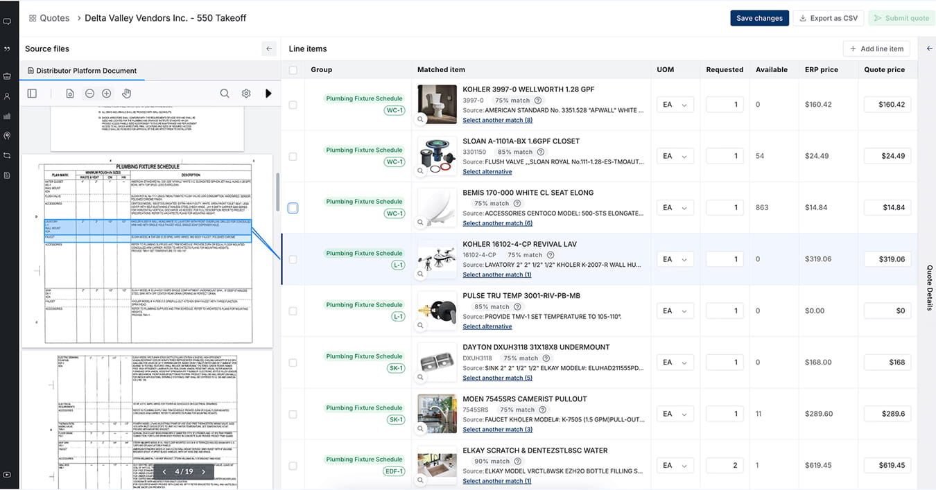 Material lists feed directly into AutoBid or QuoteTech for pricing and quote generation. What used to be a multi-day process of manual extraction, product lookup, and quote building becomes a single streamlined workflow.